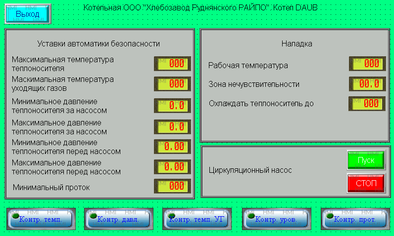 АСУ обеспечивает: управление циркуляционным насосом и газовой горелкой котла; контроль технологических параметров: давления теплоносителя в напорном трубопроводе, уровня теплоносителя в расширительном баке, расхода теплоносителя, температуры теплоносителя в прямом и обратном трубопроводах, температуры уходящих дымовых газов.