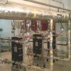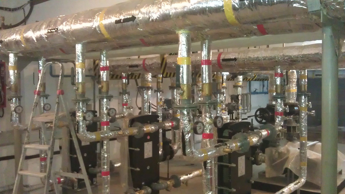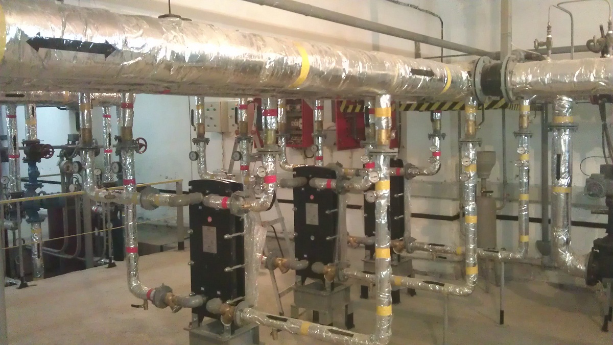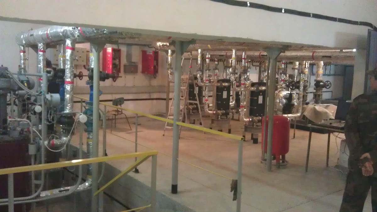 Отопление Киргизского НИИИ курортологии и высокогорного лечения десятилетиями осуществлялось от угольной котельной. За это время тепловые сети и сама котельная пришли практически в негодность и требовали серьезного капитального ремонта с заменой оборудования и 1 км наружных тепловых сетей. На это требовались большие деньги. Специалистами фирмы «МНК» был осуществлен перевод котельной на электроотопление с установкой в имеющемся подвальном помещении трех электроводоподогревателей суммарной мощностью 1200 кВт электродного типа без использования наружных тепловых сетей. КНИИКиВЛ занимает три здания: 5, 7, 8 этажей и двух- и одноэтажные пристройки общей площадью 25 000 м2. Так как водоподогреватели электродные, необходимо было смонтировать еще три теплообменника по 490 кВт каждый, и два сетевых насоса мощностью по 22 кВт, а на каждом водоподогревателе – по циркуляционному насосу 0,75 кВт (все насосы фирмы Calpeda). Для оперативного управления были установлены электрифицированные задвижки.