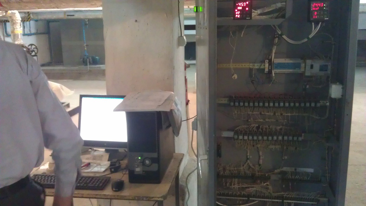 Для решения задачи мониторинга на ПК с помощью Master SCADA была создана мнемосхема, на которой отображаются 15 параметров в реальном режиме времени, что позволяет оператору контролировать состояние отапливаемых зданий, температуры прямой и обратной воды в контурах отопления, температуру наружного воздуха, а также количество подаваемого теплоносителя в единицу времени. Автоматическое поддержание заданной температуры первичного контура решается с помощью регулятора ТРМ151. Регулирование температуры водоподогревателя – с применением контролера ПЛК110, работой электропривода экрана электроводоподогревателя управляет ОВЕН ПЧВ. Электрифицированные задвижки с управлением от регулятора ТРМ212 (и датчиков температуры воздуха) позволяют выравнивать подачу теплоносителя в южную и северную часть здания. Контроль за всеми параметрами осуществляется также с помощью ПЛК110 с выводом на сигнализацию и возможностью отключения электроводоподогревателей. Все регуляторы связаны интерфейсом RS-485 с ПК через преобразователь интерфейсов AC4.