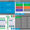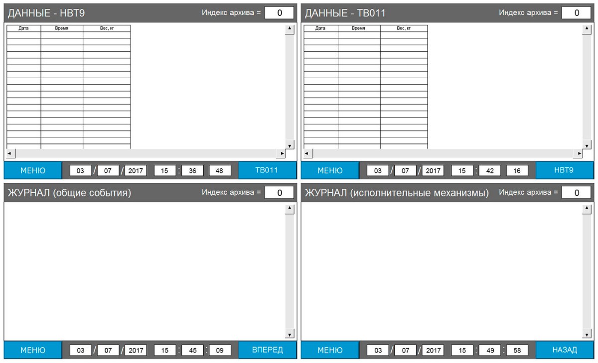 Интерфейс панели оператора состоит из четырех разделов: УПРАВЛЕНИЕ, МНЕМОСХЕМА, ЖУРНАЛ СОБЫТИЙ, ДАННЫЕ. На экране УПРАВЛЕНИЕ осуществляется выбор маршрута, а также запуск и останов технологического процесса в автоматическом режиме. На экране МНЕМОСХЕМА отображается мнемосхема склада БХМ, на которой отображаются состояния датчиков и исполнительных механизмов. Посредством мнемосхемы осуществляется управление исполнительными механизмами в ручном режиме. На экране ЖУРНАЛ СОБЫТИЙ отображается хронология событий АСУ (маршрут, запуск/останов технологического процесса, ручной режим работы, аварийные ситуации, изменения состояния исполнительных механизмов и т.п.). На экране ДАННЫЕ отображаются табличные данные с весовых терминалов Поток 60 и НВТ-9 на моменты запуска и останова технологического процесса.