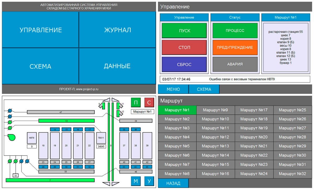 В состав АСУ склада бестарного хранения муки входит шкаф управления, к которому подключены датчики и исполнительные механизмы. Автоматика шкафа управления построена на базе программируемого логического контроллера ПЛК110-60 и модулей ввода-вывода серии Мх110 производства ОВЕН. Управление технологическим процессом осуществляется посредством сенсорной панели оператора.