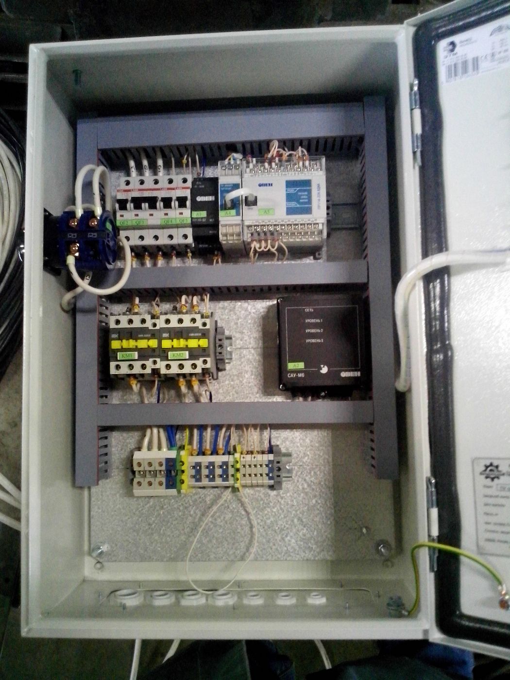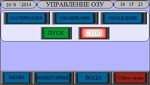 Основой пульта управления является программируемое реле ОВЕН ПР114 с панелью оператора Weintek MT6050iH. Для контроля уровня воды в емкости заквасочника используется кондуктометрический датчик ДС.1 совместно с сигнализатором уровня САУ-М6. Контроль температуры продукта и воды в емкости заквасочника осуществляется с помощью термопреобразователей с унифицированным выходным сигналом тока.