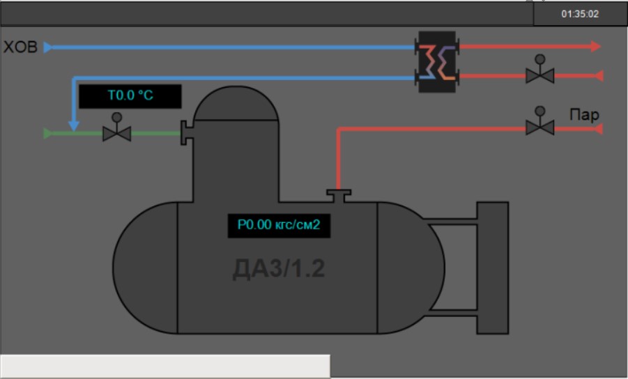 Автоматическое поддержание уровня, давления и температуры осуществляется при помощи сенсорного панельного контроллера ОВЕН СПК107[М1], для измерения текущих параметров и управлением исполнительными механизмами используются модули ввода-вывода ОВЕН Мх110. Управление исполнительными механизмами осуществляется посредством промежуточных и твердотельных реле от KIPPRIBOR.