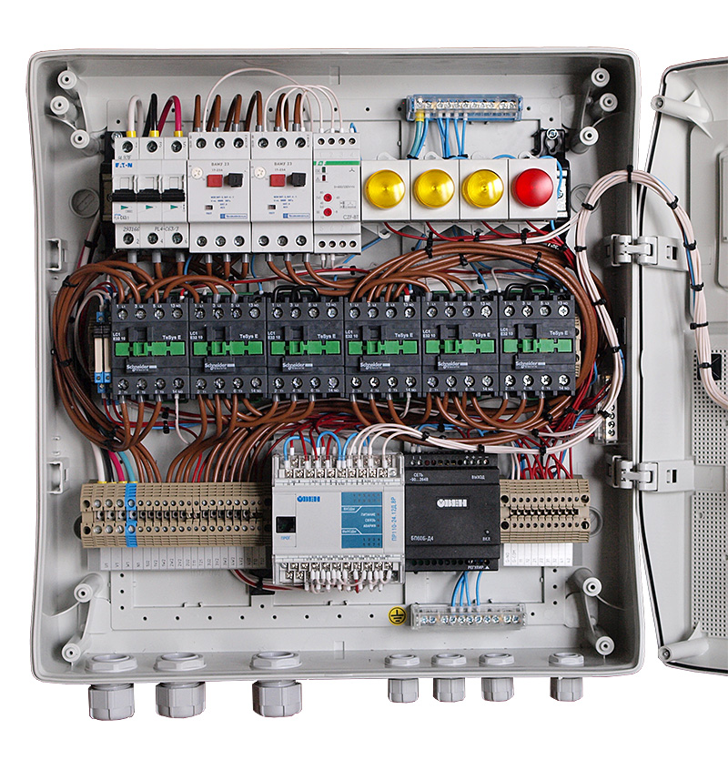 Щит управления насосами предназначен для регулирования насосов канализационных систем. Алгоритм работы аналогичен алгоритму прибора управления насосами Grundfos LCD 108…SD.