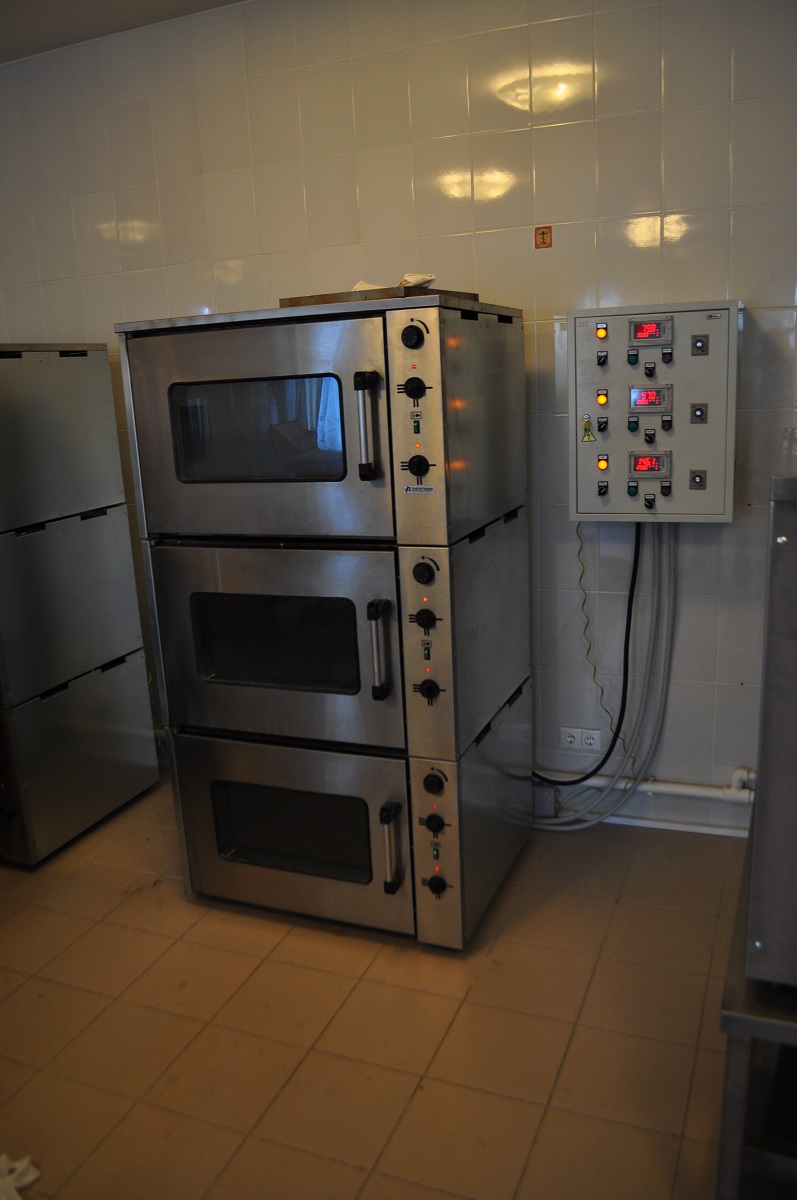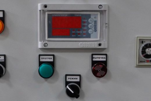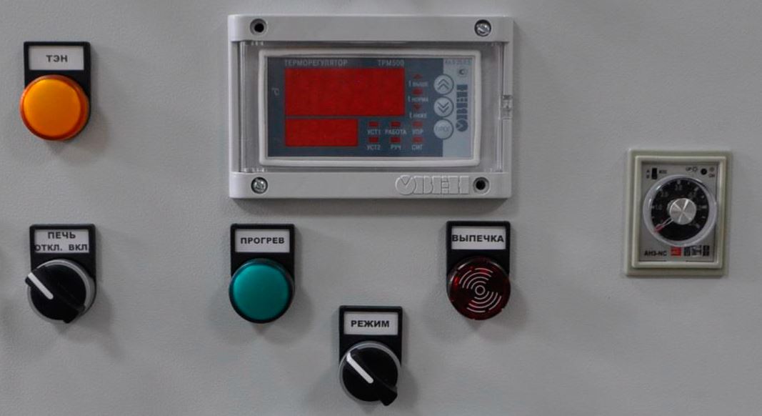 Шкаф управления печи (ШУП) предназначен для управления секционными жарочными шкафами типа ШЖ-150 (ШЖ-150-3С). Значение поддерживаемой температуры (прогрев и выпечка) задается с панели управления терморегулятора ОВЕН ТРМ500, сигнал обратной связи поступает от датчика температуры ОВЕН ДТПL034, установленного в жарочной секции. Продолжительность выпечки контролирует регулируемое реле времени АН3.