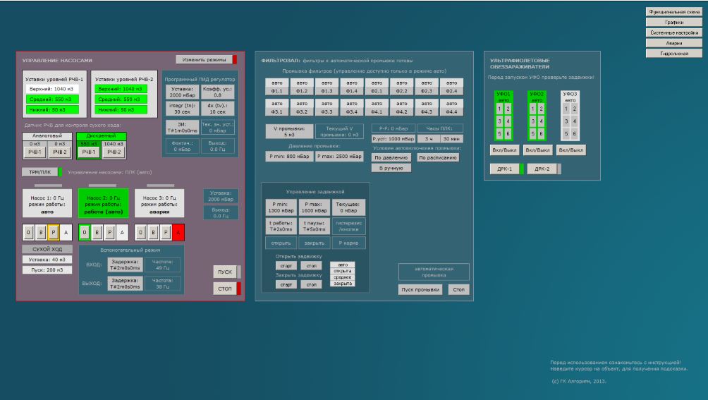 Через панель управления можно выбирать режимы работы насосов, задавать параметры уставки, переключать насосы, запускать/останавливать насосы, включать/выключать УФО, производить промывку фильтров в фильтрозале в трех режимах.