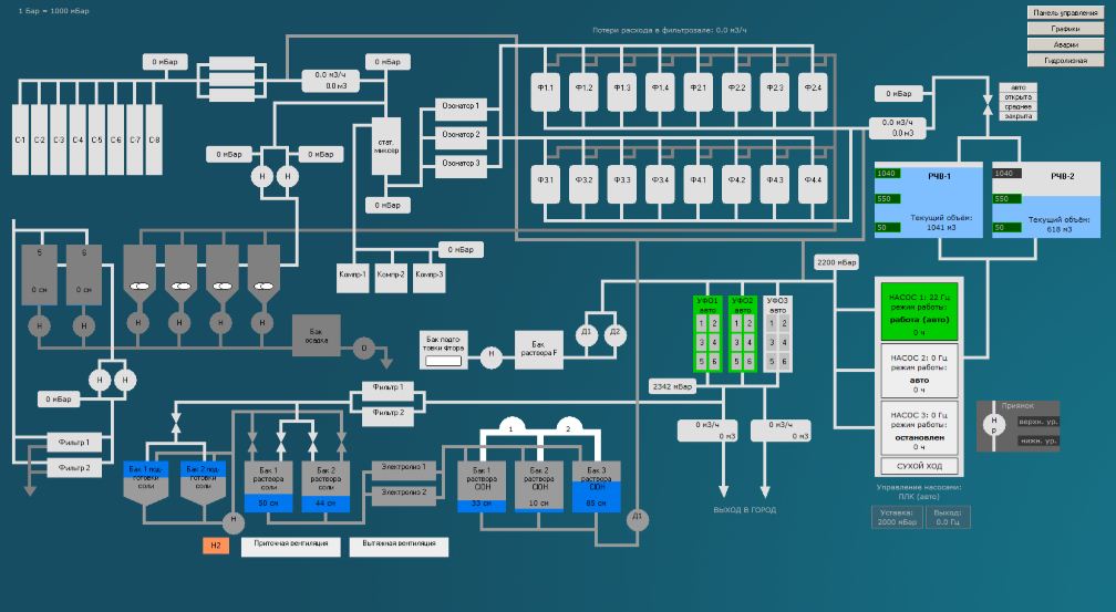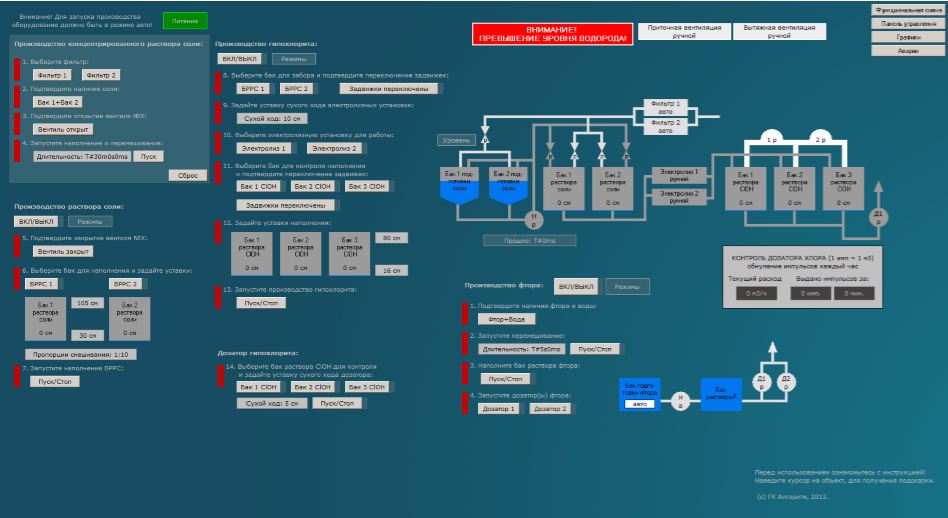 Основное назначение гидролизной – производство раствора гипохлорита (ClOH) для смешивания его с водой подаваемой потребителям в целях обеззараживания. Панель производства гипохлорита реализована в виде пошаговой интерактивной схемы, которая состоит из последовательности выполняемых пунктов. Это интуитивно понятный интерфейс, условно разделенный на составляющие: