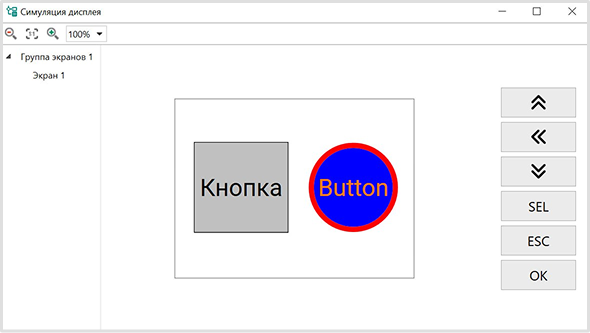 В редакторе визуализации ПР205 и ПР225 теперь доступен элемент «Кнопка». Он поддерживает настройку стиля, формы (круг/прямоугольник) и надписи. Реализовано три варианта взаимодействия: короткое нажатие, длительное нажатие и удержание.