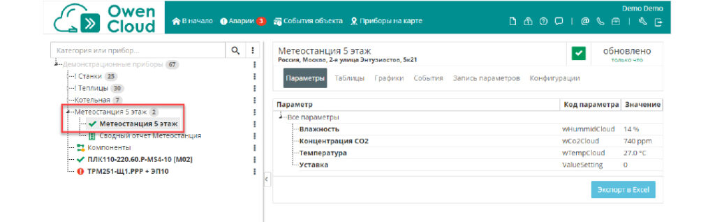 В наших примерах мы будем работать с устройством Метеостанция, которое добавлено в демо-аккаунт облачного сервиса