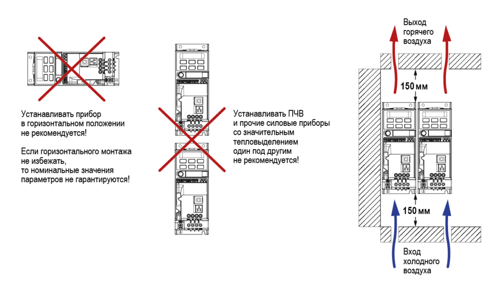 - Категорически запрещается располагать преобразователи частоты или другие тепловыделяющие устройства друг над другом