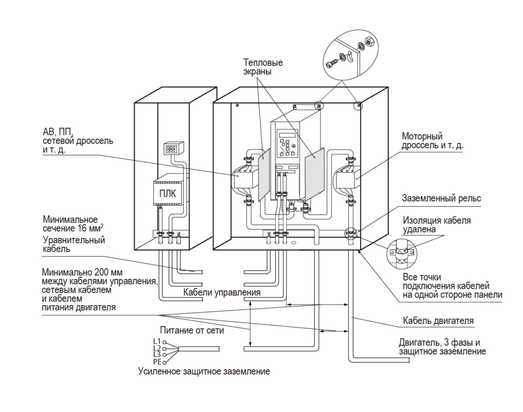К подключению приступают после установки преобразователей частоты в шкафу и фиксации аппарата крепежными изделиями.