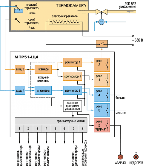 в МПР51-Щ4 используется компаратор 1, который в случае превышения ΔТ заданного значения блокирует включение реле 2, подающего пар для нагрева камеры.